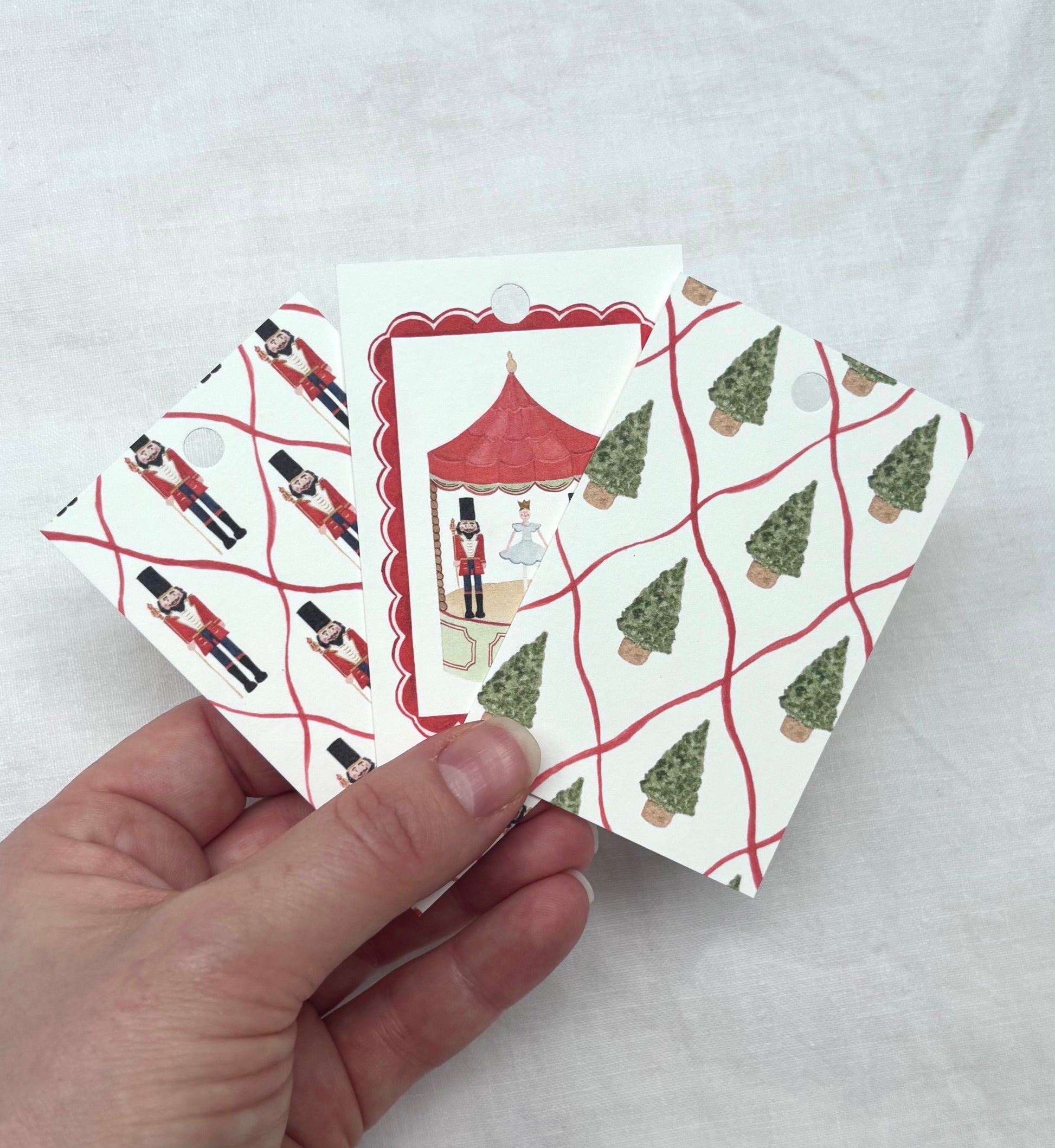 Packs of 9 Illustrated Christmas Gift Tags. 3 of each design. Tags only, rectangular shape with pre punched hole to fit ribbon/string through.