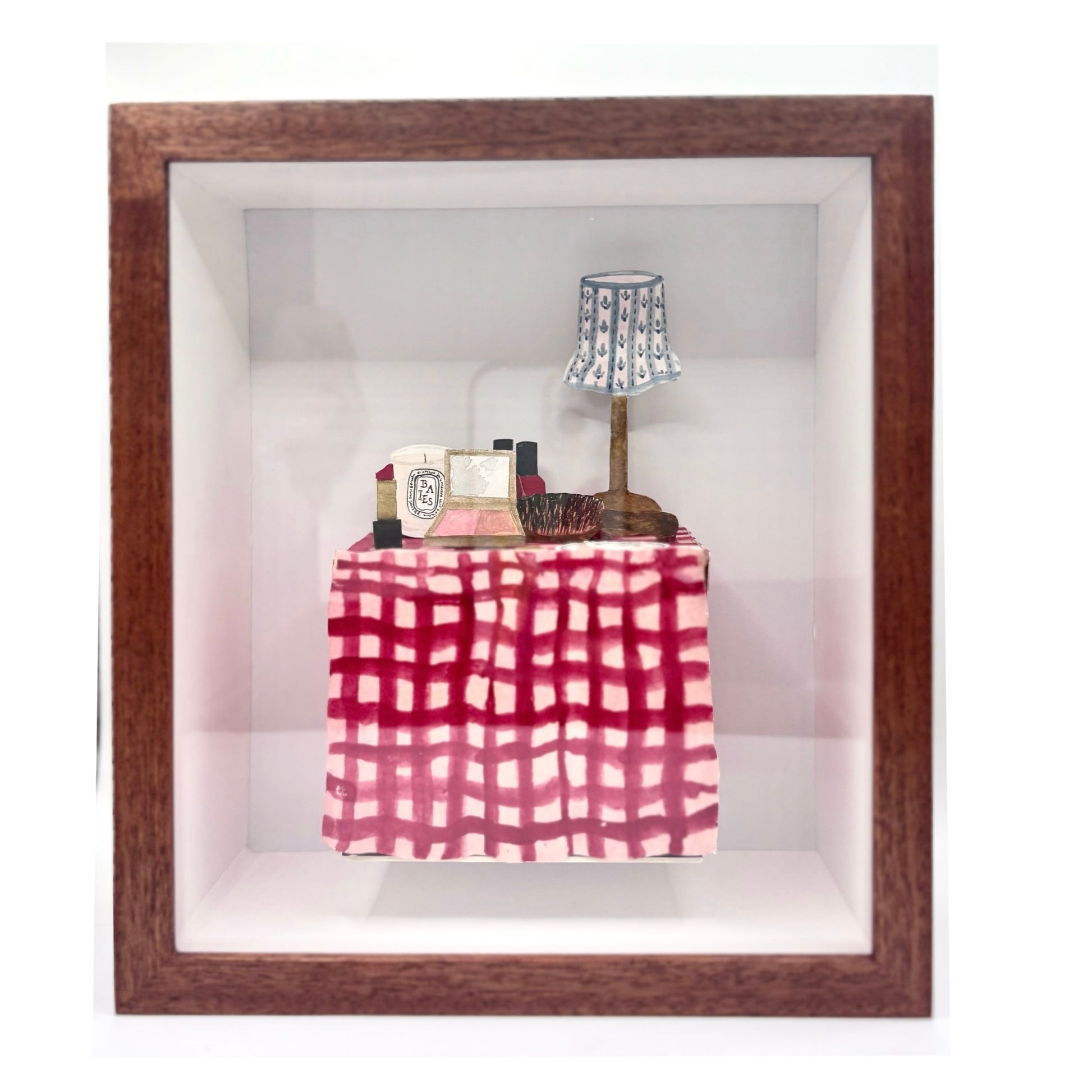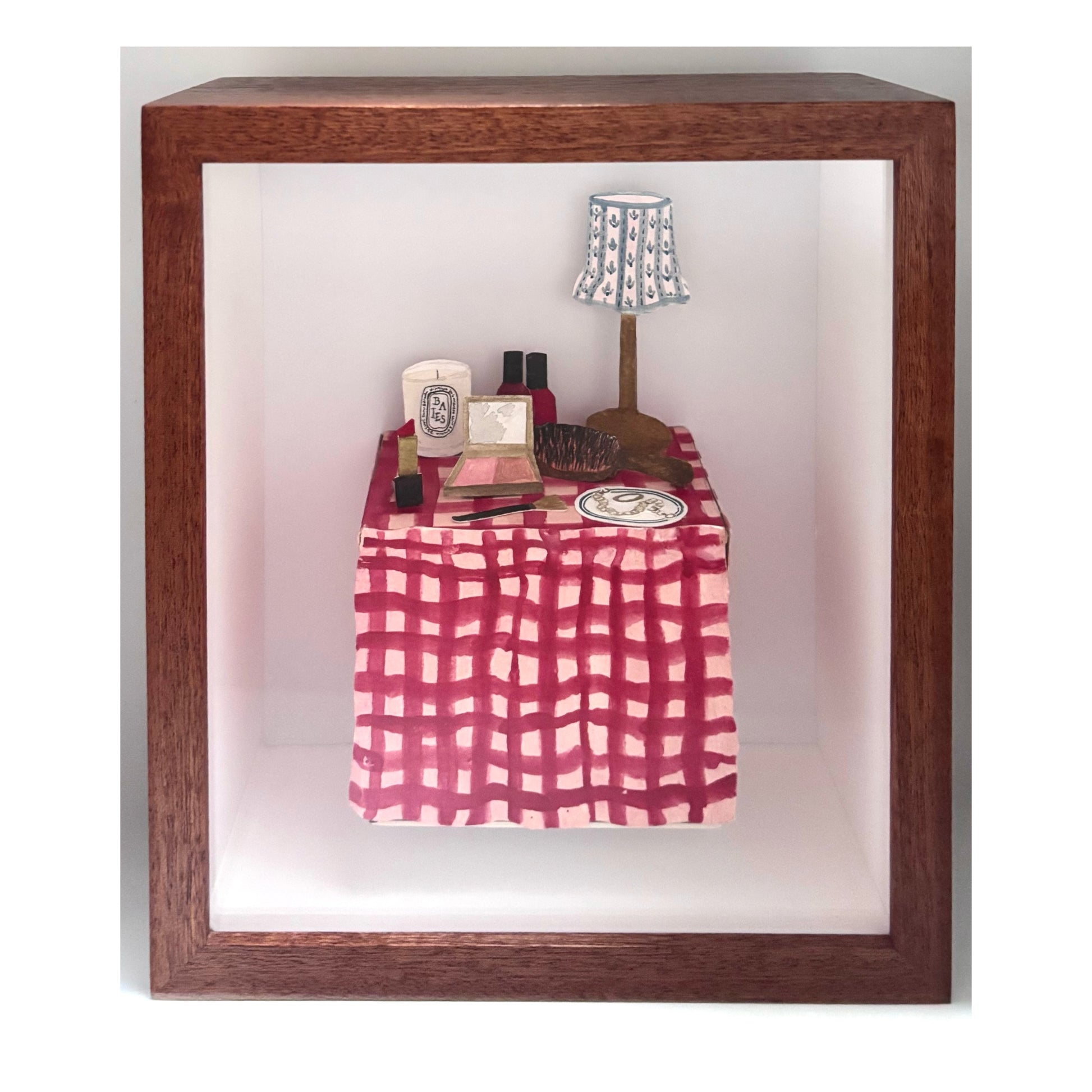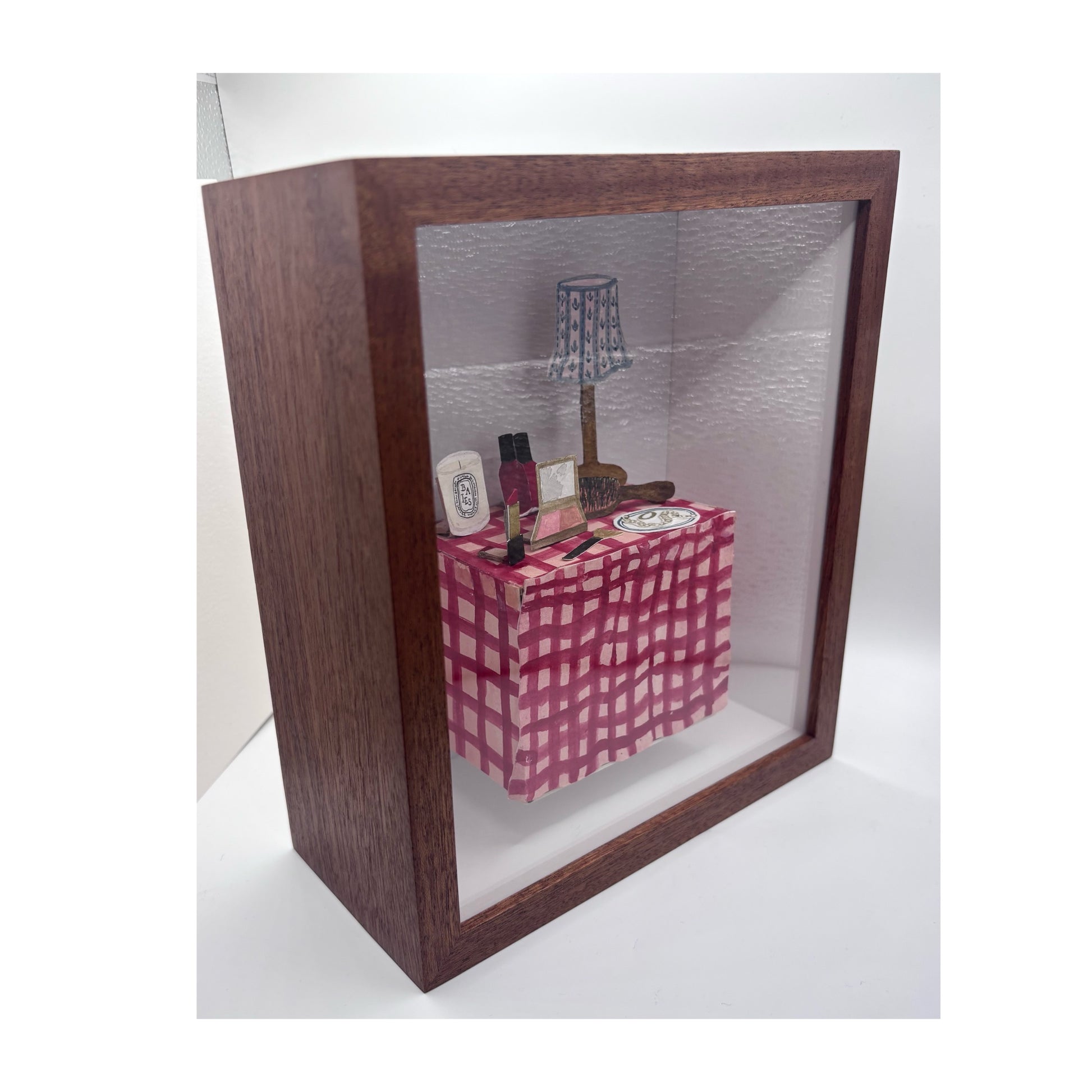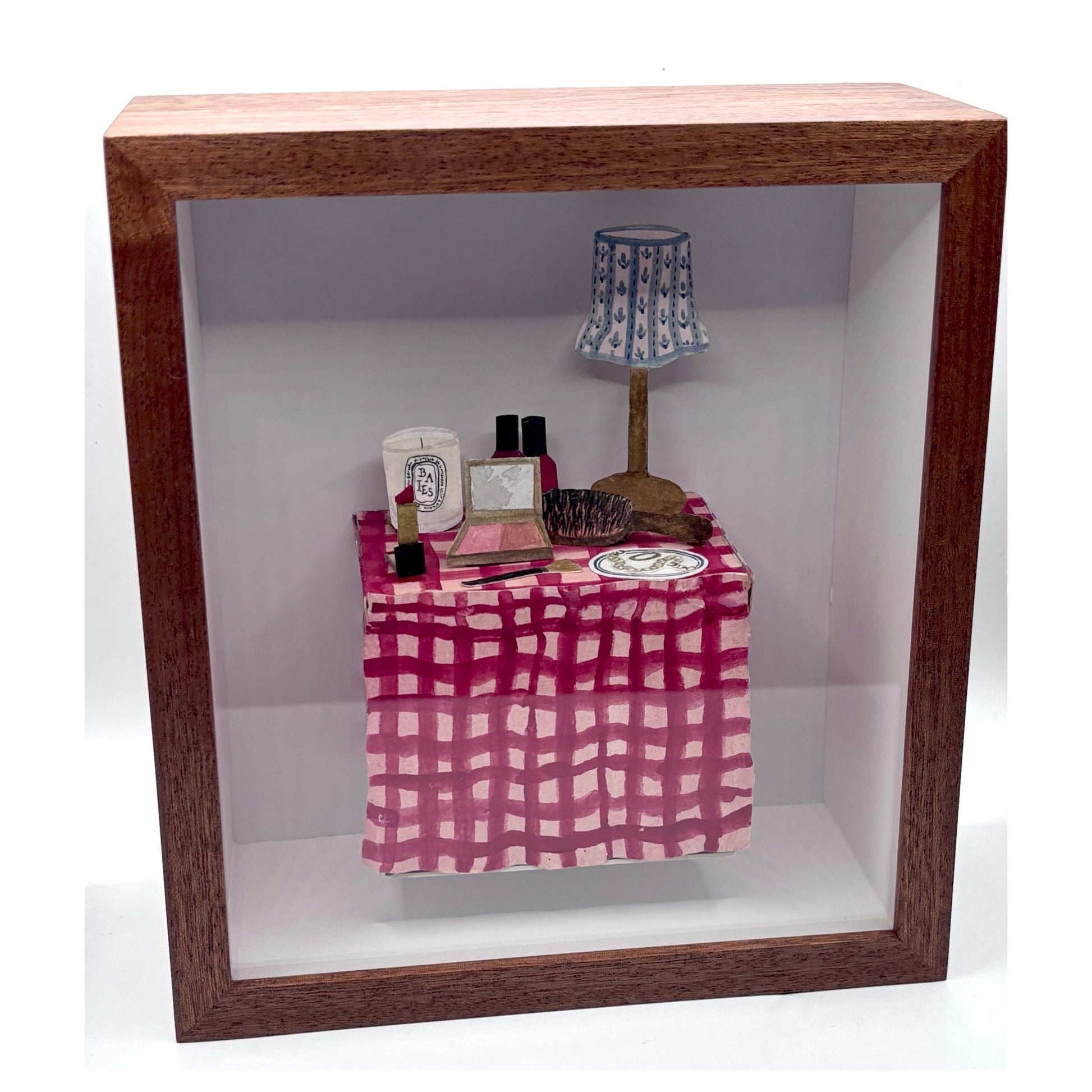 A framed miniature artwork of a hand painted and crafted miniature vanity table. Mounted and signed original artwork. Bespoke wood framing by Frmd Clapton.