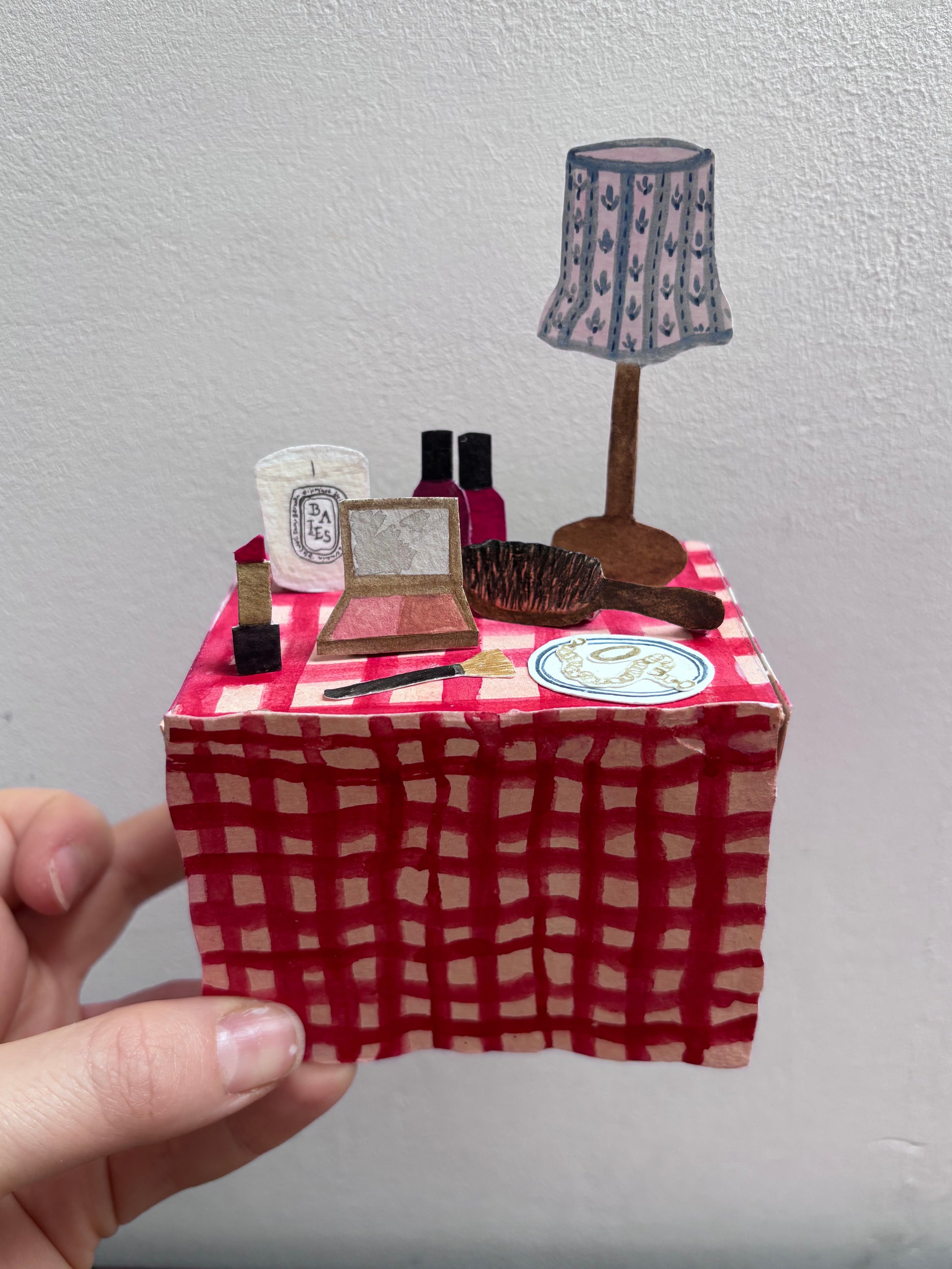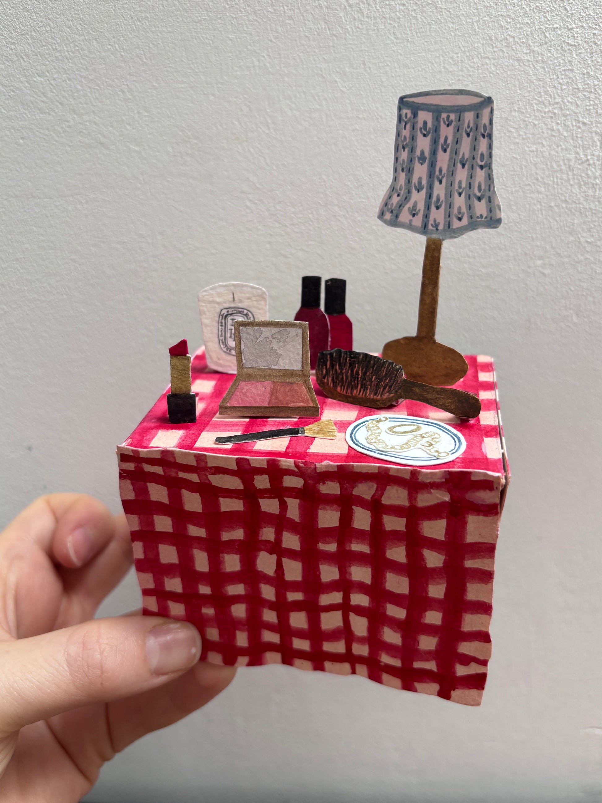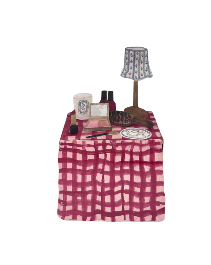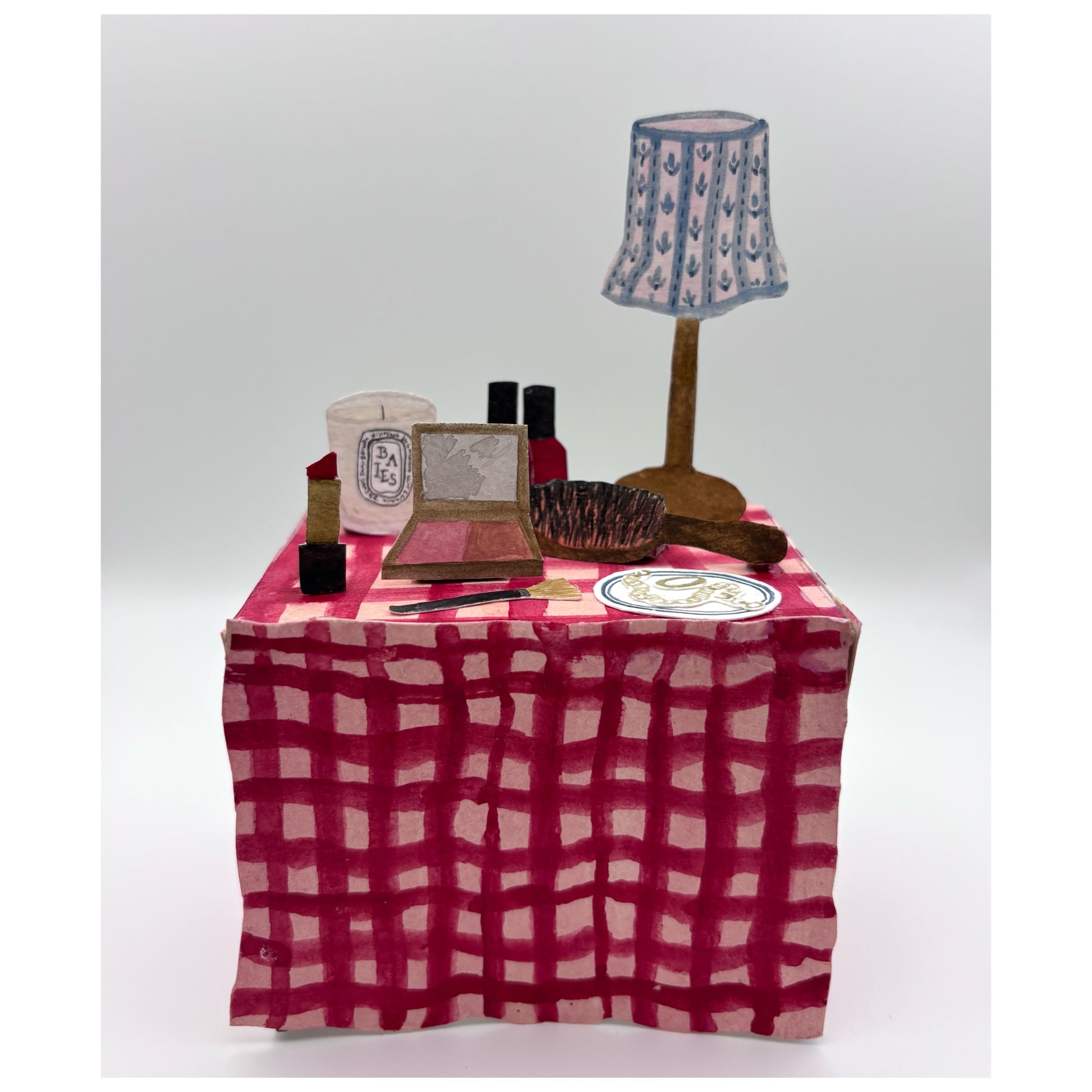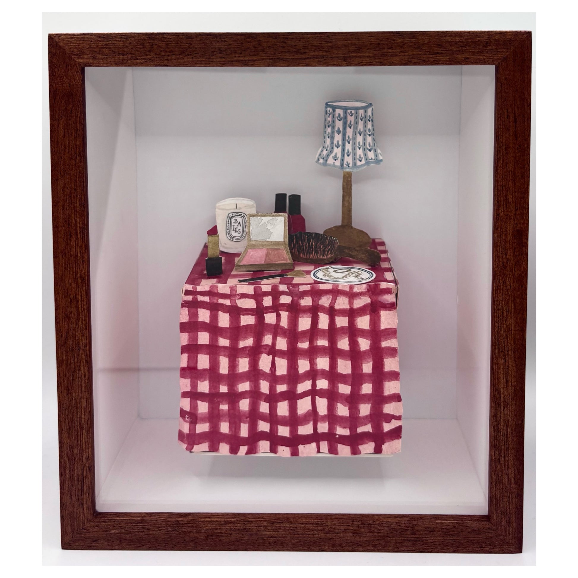 A framed miniature artwork of a hand painted and crafted miniature vanity table. Mounted and signed original artwork. Bespoke wood framing by Frmd Clapton.